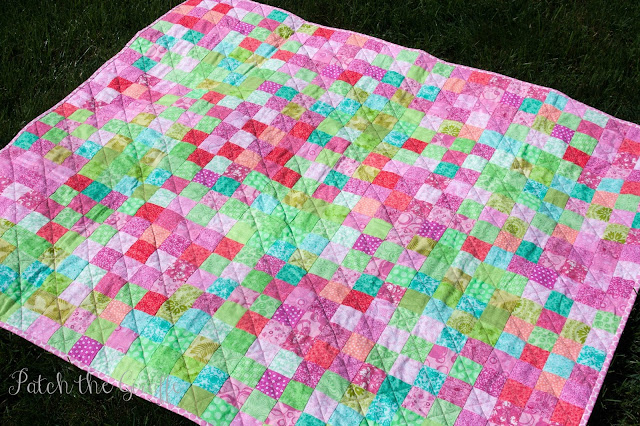 This quilt was made with a variety of pink and green patterns so make up with watermelonish quilt. I don't remember much about the process or the inspiration. I went with straight line stitching for the quilting in a bright pink thread, once again using the Target sheet for the back and the poly batting. The binding is a pink polka dot I had cut into 2.5 inch strips a while back and I had enough of the same color to bind the whole thing. Sometimes things just work out :)